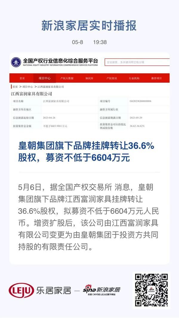 5月6日,据全国产权交易所消息,皇朝集团旗下品牌江西富润家具挂牌转让36.6%股权,拟募资不低于6604万元人民币。增资扩股后,该公司由江西富润家具有限公司变更为由皇朝集团于投资方共同持股的有限责任公司。