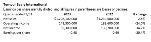 报告显示,截至3月31日,泰普尔-丝涟国际集团的一季度净销售额约12.1亿美元,而去年同期为12.4亿美元。第一季度净利润为8530万美元,比去年同期的1.307亿美元同比大幅下降了34.7%。