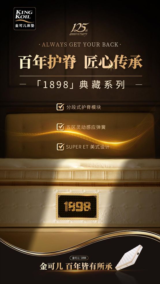 2023年,金可儿迎来了品牌成立125周年庆,而“1898”这一特别的数字,也被设计在了典藏系列的床标上。在这一个特别款的床标设计上,凝聚了金可儿的品牌发展历史,从1931年金可儿获得“弹簧之王KING Of COIL”的美称,到1967年金可儿开启与ICA的护脊合作,再到品牌历经百年后行销全球,并连续11年获得“中国文旅星光奖”,成为业界长青品牌。可以说,小小的床标既是标志着金可儿发展的重要符号,也承载了“1898典藏系列”所蕴含的致敬深意。