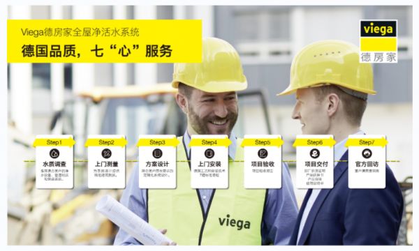 Viega德房家为消费者提供一体化的“七心”服务,包含水质调查、上门测量、方案设计、上门安装、项目验收、项目交付、服务回访,从净水到管道,提供一站式采购和服务,消除用户的后顾之忧。
