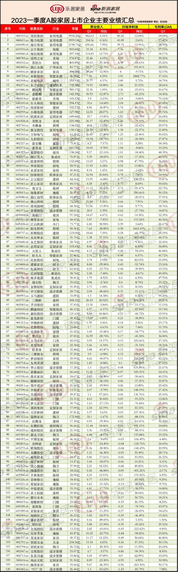 视线 | 2023一季度家居上市企业榜单出炉 “市值 营收 净利 毛利”一览无遗