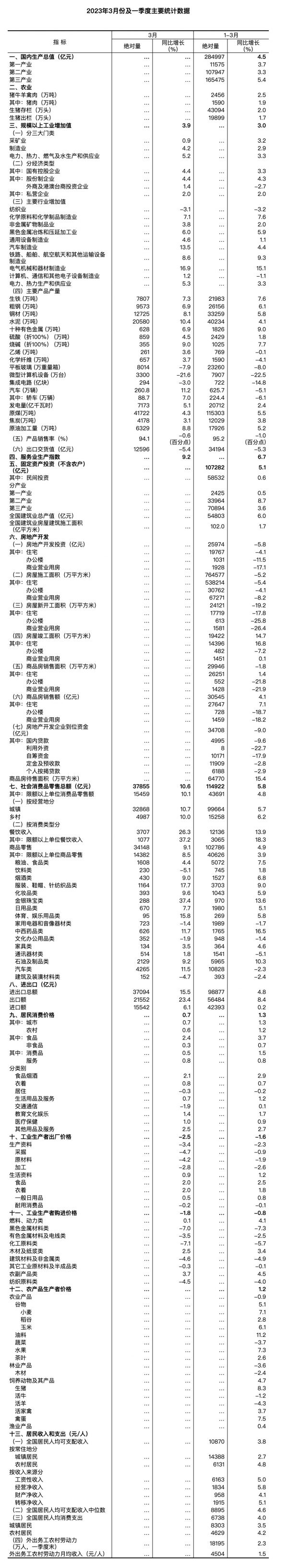 附:2023年3月及一季度主要统计数据