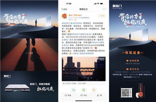 借由故事征集,喜临门聚合了更多群体的共情、共感,颠覆了品牌单向输出的营销方式。面对用户的评论与故事分享,喜临门将其制成九宫格海报,将用户“背后的力量”裂变传递,把人们心中的那股热爱、初心、勇气等无限传递,让大众真正看到了百样人生“背后的力量”,以及喜临门温暖关怀下的情感共鸣。