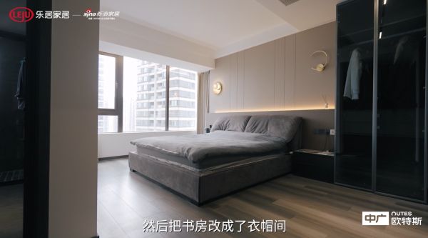 主卧空间延续了现代简约风格,搭配有暖光的玻璃衣柜,营造出温馨、舒适的居住氛围。空间改造方面,把原本的书房改成了衣帽间,满足了家里女主人的收纳需求。
