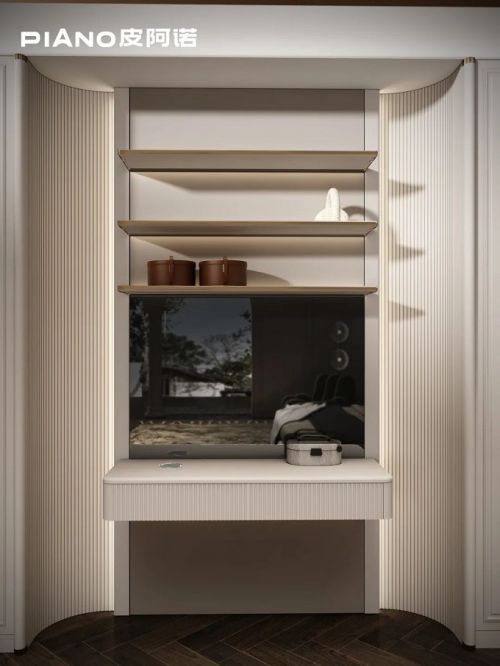 卧室梳妆柜壁挂式结构,以圆弧衬托,为空间注入柔和之美。桌面配置隔空无线充电黑科技,360°圆孔散热设计时尚感拉满,设计简约,隐匿于桌底,随放随充,高效便捷。