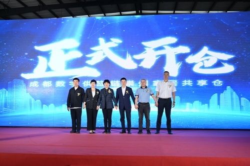 张文军、徐剑、刘洪彬、周云、赵俊怀、王占强一齐上台为成都数字供应链崇州家居共享仓举行开仓仪式。