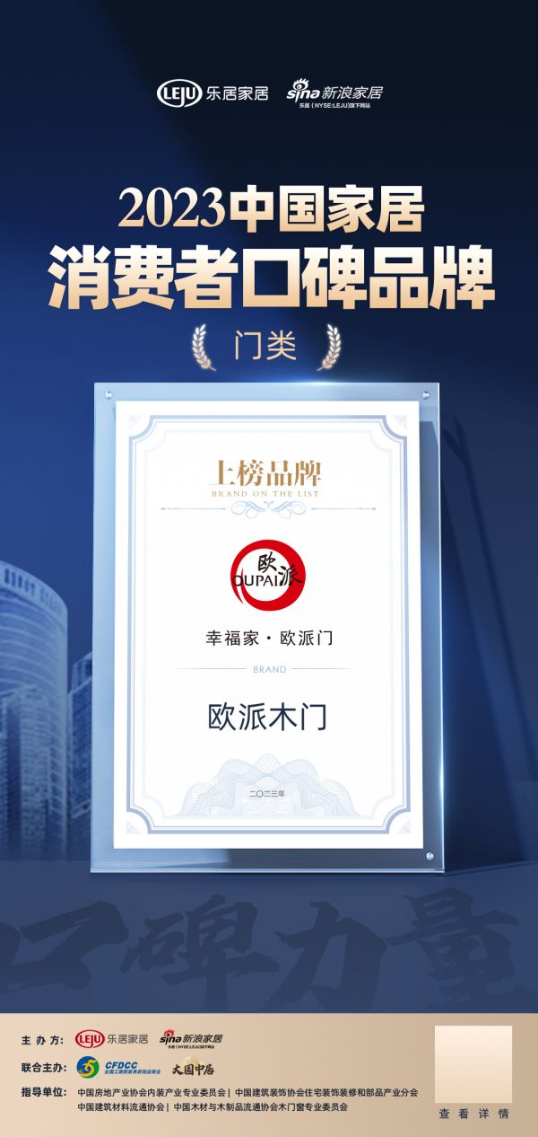 “洞悉口碑消费之下的价值驱动,用消费口碑见证品牌力量”,自4月15日问卷调查启动以来,在为期近25天的《2023中国家居消费者口碑调查》活动中,欧派木门荣登“2023中国家居消费者口碑榜”。