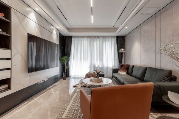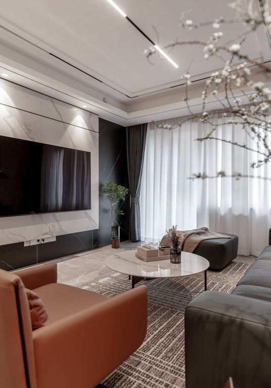 【王雪兰】本案设计理念:客厅采光通透,各大功能区划分干净利落。大面积的大理石墙面,温柔的皮质沙发,炫亮的金属边几,让整个空间既奢华又内敛。玻璃陈列柜丰富了空间的层次,摆满书籍和艺术品,凸显业主的优雅品味和生活乐趣。