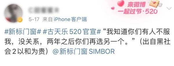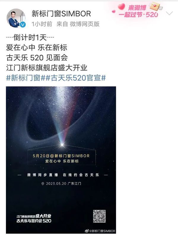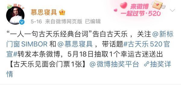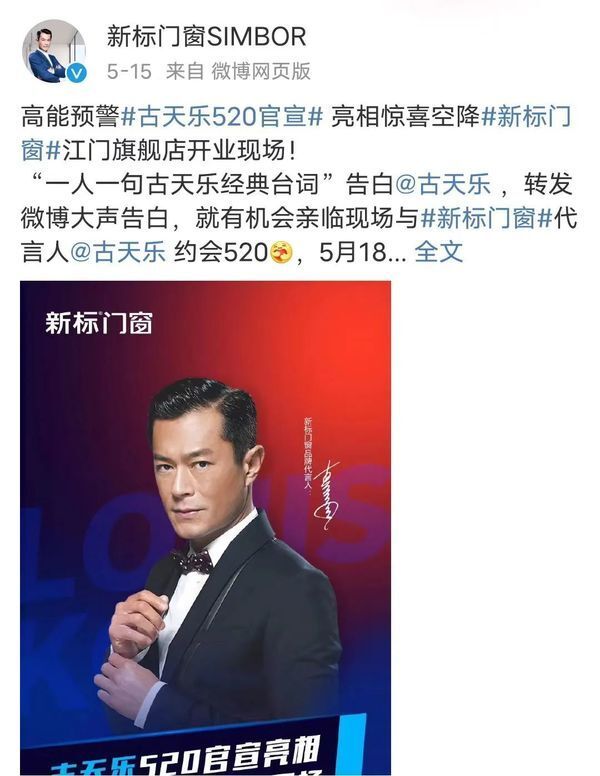 微博话题冲上热搜,引爆热议新标门窗品牌官方微博@新标门窗SIMBOR 牵手古仔,发起#古天乐520官宣#话题,举行「古天乐见面会门票」线上互动抽奖活动,还大派520专属口红好礼,实力宠粉。