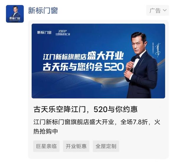 新标门窗联袂古天乐强势登录微信朋友圈,给广大朋友带来520专属家装好礼,更重磅推出限时钜惠惊喜,直撩人心,霸屏出圈。