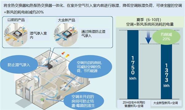 零能耗建筑具有高气密性、高绝热性的特点。为了改善住宅空气品质,新风的引入必不可少。大金全新研究开发了用于零能耗建筑的新风换气系统,引进新风的同时,也有效减少空调和新风的能耗。