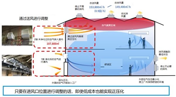 大金通过对一座建筑年限超32年的老旧工厂进行改造,改善空调、换气方面存在的问题。工厂改造比较复杂,除了初投资较高的建筑保温升级和设备更新,运行策略优化同样可以达成降耗的目的。大金对该工厂进行了详细的调查分析,采用了一系列的运行方案调整,例如排风系统的变风量控制,改善新风和排风的气流组织,根据季节调整车间的正负压控制、使内外空气流通……这些措施使工厂空调能耗下降了26%,也改善了车间的工作环境,为其他年代久远的老旧工厂空调改造和环境改善提供了新的思路。