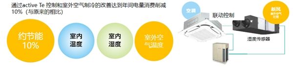 因此,在提升空调产品的节能性之外,大金创新开发了通过空调与新风换气联动实现大幅度节能的大楼用多联机,空调和新风设备联动,根据外气变化智能调整运行控制,使系统处于更高效的状态,满足健康舒适的同时,相较常规系统,还可实现约10%的年节能率。