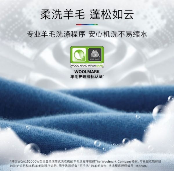 博世全自动滚筒式洗衣机的羊毛洗程序获得WOOL MARK 手洗羊毛洗涤程序绿标认证,可根据衣物标签的洗护说明和本机羊毛洗程序说明,用于洗涤标有“可手洗”的羊毛衣物,洗涤程序授权编号:M2248。