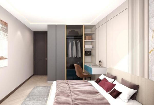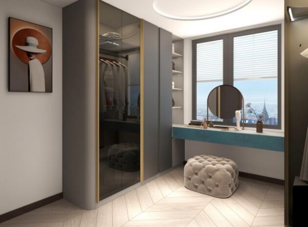 高定落地柜体,延伸出一张梳妆台,没有繁杂的装饰,简洁明亮的衣帽间,给人一种放松的心情。
