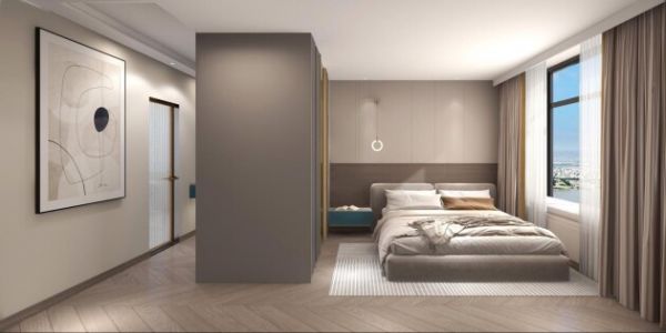 主卧空间去风格化设计呈现出安逸而舒适的铺陈,似乎在强调空间的睡眠属性,呈现出迷人的“暖系”调性,没有过多亢余和浪费的设计语句也没有所谓的造型,一切呈现出舒适宜人的姿态。