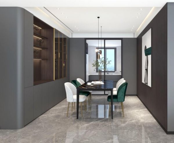 治愈系的绿色亦能在空间设计中绽放光彩,集合式的多功能架构,从收纳到展示,各功能区顺畅地围绕空间有序分布,空间的大理石肌理搭配深绿色系,步入其中犹如闯进绿野仙踪之地。