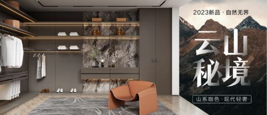 云山秘境——设计师用镶嵌云石的表现手法呈现背景墙,凸显出山脉的硬朗和品质感;搭配采用准分子 UV 工艺的门板,使其触感如丝绒般细腻。两相结合营造山的质感与云的轻柔,搭配木纹家具使用,调性一致且高端的全屋设计,是陆星辰类型的气质男神心仪之选。