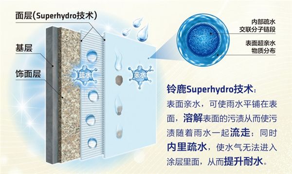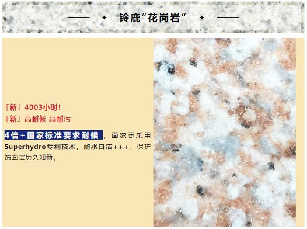 花岗岩主材&面漆,耐老化测试 4003小时 ,4倍+国标耐候,饰面效果靓丽持久。面漆采用Superhydro专利技术,内里疏水-保证涂层耐水好,表面亲水-祛污自洁持久靓丽。