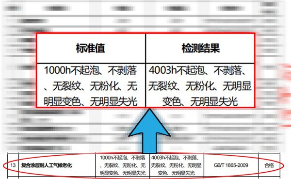 复合涂层耐人工气候老化指标是指用经滤光器滤光的氙弧灯作为辐射源,模拟自然条件对涂层进行人工气候加速老化,最后评定样板老化结果的检测。通过这个指标我们就可以了解这款复合涂层的耐候性究竟如何,是否易产生气泡、剥落、开裂等问题,数值越高,产品的耐候、耐久性能就越好。