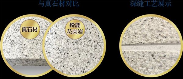 铃鹿花岗岩的 超高仿真度 ,是通过彩砂显色,聚砂成石使色点间融合度高,具有如真石材般润泽感,且色点中添加云母片,仿石效果更佳自然、逼真。