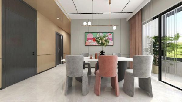 一个小细节!餐椅、抱枕与躺椅,一致的脏橘色,贯穿空间的左中右,设计师用这种色彩的过渡,把客厅与餐厅两个功能区域彼此连接,避免视觉上的割裂感。窗帘选用雅琪诺悦动风华系列,其色彩突出当下大火的纯欲风。拉上窗帘,是夜晚灯火通明的温馨美满;拉开窗帘,是清晨沐浴阳光的幸福元气,让生活充满令人期待的小惊喜。