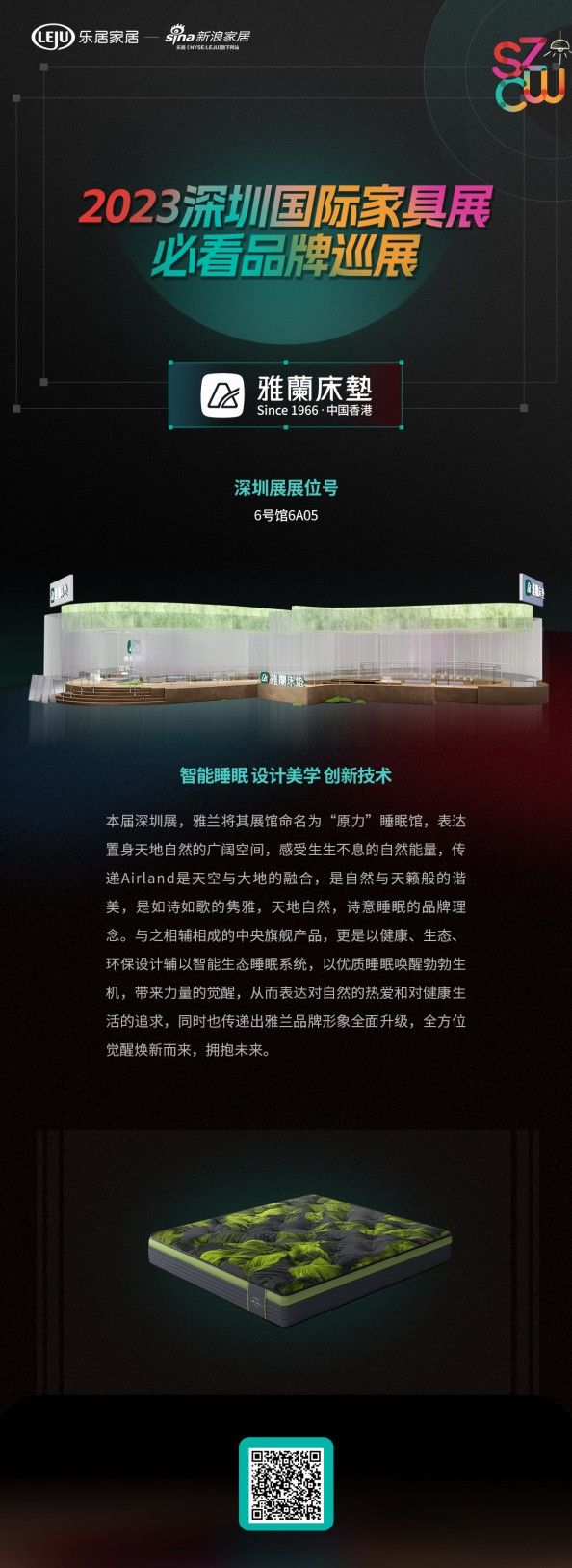本届深圳展,雅兰将其展馆命名为“原力”睡眠馆,表达置身天地自然的广阔空间,感受生生不息的自然能量,传递Airland是天空与大地的融合,是自然与天籁般的谐美,是如诗如歌的隽雅,天地自然,诗意睡眠的品牌理念。与之相辅相成的中央旗舰产品,更是以健康、生态、环保设计辅以智能生态睡眠系统,以优质睡眠唤醒勃勃生机,带来力量的觉醒,从而表达对自然的热爱和对健康生活的追求,同时也传递出雅兰品牌形象全面升级,全方位觉醒焕新而来,拥抱未来。
