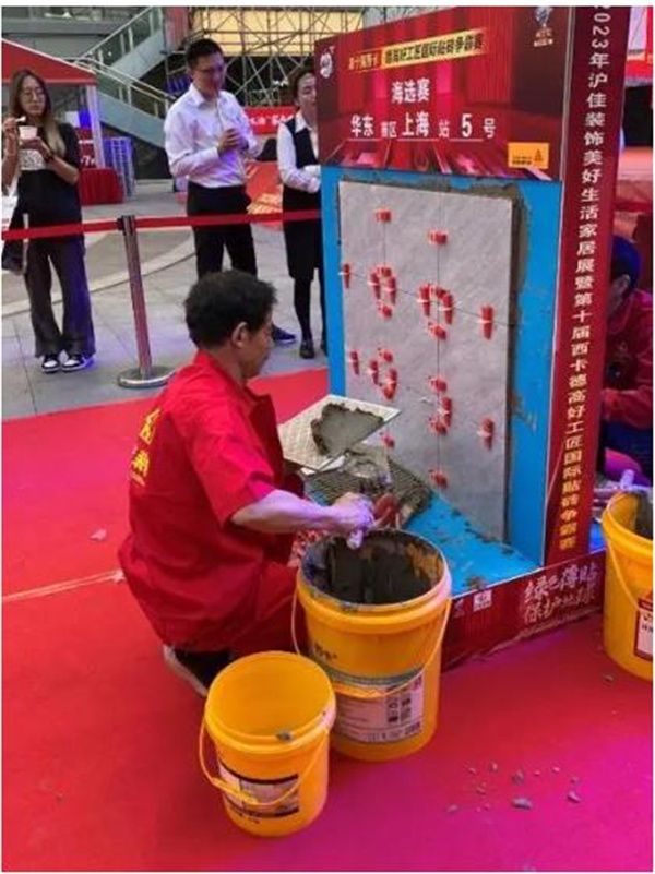 本届大赛以“绿色薄贴,保护地球”为主题,在这场盛大的活动中,参赛选手们展示了他们在贴砖技术上的娴熟技巧和高超技能。作为西卡德高的合作伙伴,上海沪佳装饰提供了全方位的支持和组织。活动现场热闹非凡,充满了竞技与创意氛围,围观市民也是络绎不绝。