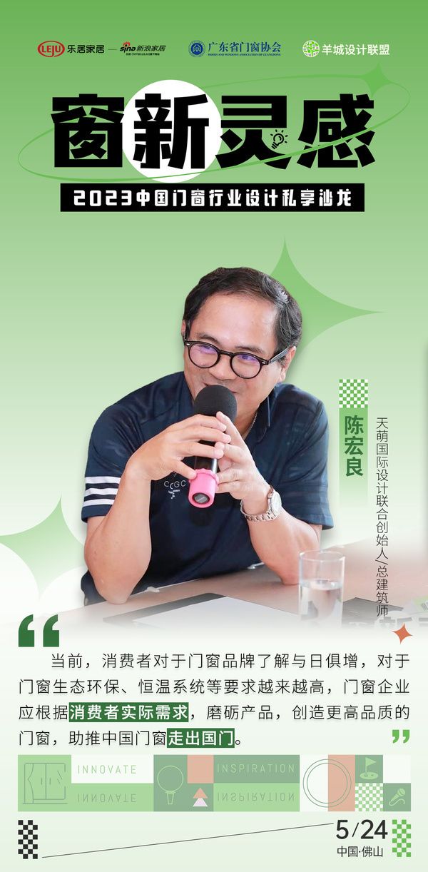 天萌国际设计联合创始人/总建筑师 陈宏良:当前,消费者对于门窗品牌了解与日俱增,对于门窗生态环保、恒温系统等要求越来越高,门窗企业应根据消费者实际需求,磨砺产品,创造更高品质的门窗,助推中国门窗走出世界。