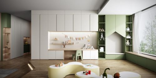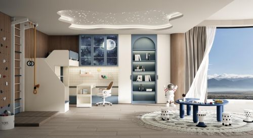 同时,「云舒」系列产品采用儿童级环保材质,健康环保,有害物质零释放;六面同色工艺,六面无缝喷粉,细节更精致,还有一体造型免拉,防磕碰,更安全可靠。不仅如此,亲子客厅中去“客厅化”设计,满墙书柜和学习区替代了电视,打造出充满阅读氛围的亲子空间;而儿童房则以星空为主题,发光背板把浩瀚宇宙搬回家,丰富了孩子的想象空间。