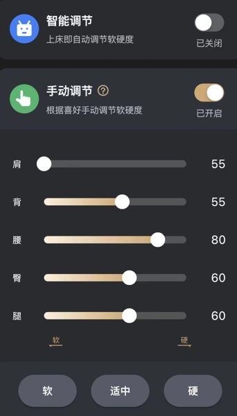 如果不满意智能调节的软硬度,还可以根据喜好手动调节,千人千面,总能找到适合自己的软硬度,舒服与否,如人饮水冷暖自知。