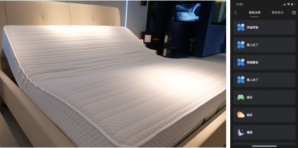 记1者实测,语音唤醒“您好小慕,我起床了”“出门了”“到家了”“我要看书”“我困了”之后,家中床垫、智能电动床、各自电器会进行自动调整进入适合的模式。例如窗帘会自动打开,空调自动开启,智能电动床头部自动抬起调整到最佳的角度,脚部抬高40度让身体放松等。