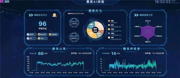 针对此睡眠痛点,AI床垫应用了最1先进的非接触式生物识别传感器技术,可精准跟踪个人呼吸、心率、肢体运动等,每晚可产生上亿个生物识别数据点,每秒可对用户身体进行上百次数据追踪。