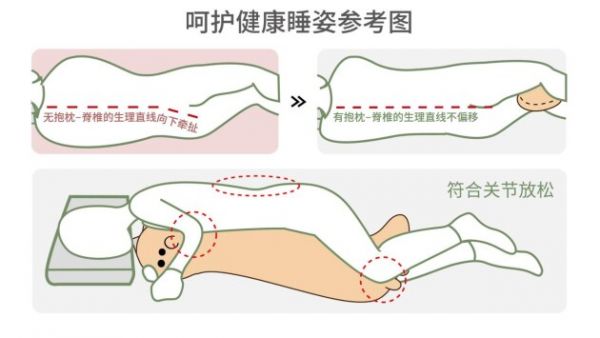 健康睡姿影响着身体的许多方面:颈椎健康、腰椎健康、血氧浓度、呼吸系统等等,其中颈椎健康和腰椎健康是最主要的关注点。这就代表着你需要在各种睡姿中,找到合适支撑物,让你的颈椎和腰椎舒适放松,这时候你需要找到一个合适的枕头和一个专业的睡觉抱枕。