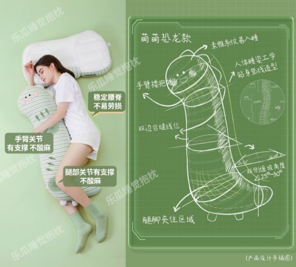 乐瓜睡觉抱枕结合国内外睡眠理论和大量数据调研,专门开创针对侧睡呵护腰和腿的睡觉抱枕,在生理上减轻侧睡和仰睡造成的压力负担,减少身体酸累麻感,稳定睡姿,减少翻身;还能在心理上满足大家对伴睡用品和拥抱的情感需求,加快入睡和睡眠的踏实感,从而提高睡眠质量。