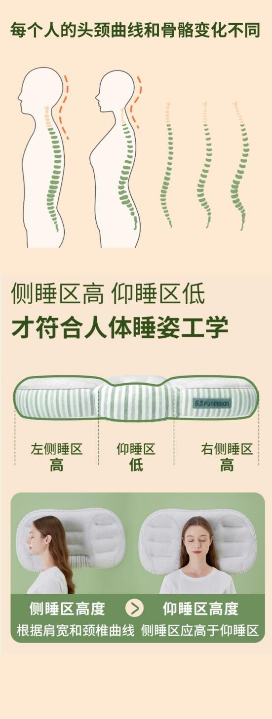 大多数人都不知道,仰睡和侧睡所需的枕头高度是不一致的,不合适的高度容易导致肩颈出现酸累的问题。而且由于每个人的头颈曲线和骨骼变化都不同,所以对于枕头的高度需求也各不相同。