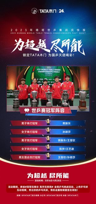 北京时间5月28日晚,经过9天对决的2023年德班世乒赛正式闭幕,国乒包揽了五冠。作为一场竞技性的赛事,在球场上运动员们奋勇争先,为超越对手和自己竭尽所能。而在球场下,世界乒乓球锦标赛战略合作伙伴TATA木门也秉持这样拼搏向上的精神,在行业的竞争中争夺冠军,为超越而战!