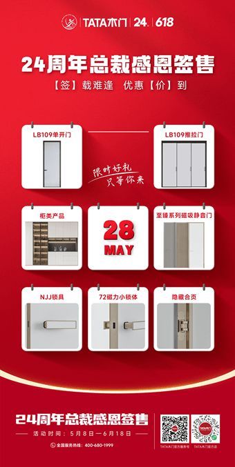 除此之外,为回馈24年来一直支持TATA木门的老用户,TATA木门“24周年 总裁感恩签售”百城落地活动也已开启,5月27日起,总裁签售活动现场不仅有精美的文创礼品发放,更有超值福利政策持续放送给消费者。