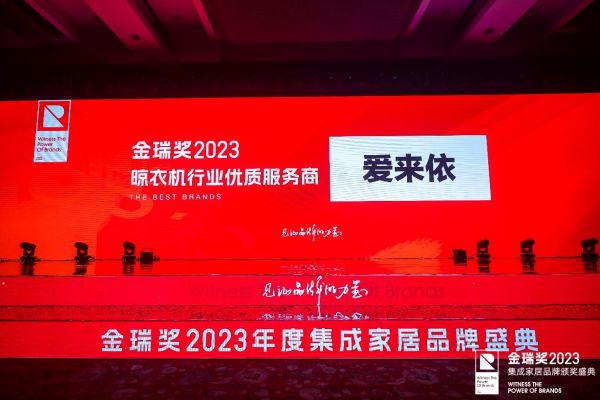 在金瑞奖2023年度品牌颁奖盛典上,爱来依荣获“2023 年度晾衣机行业优质服务商”。