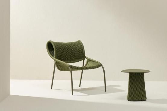 这一整套家具包括餐椅、休闲椅、扶手摇椅和边几,精巧设计融入其中,飞 天系列所运用的编织工艺展现出美妙细腻的肌理,远观近看各有千秋,让人想起