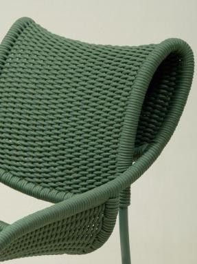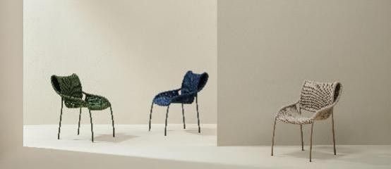 曾静华在餐椅的设计中使用了椅子的坐面和靠背呈现出三维曲面的结构,以 两种不同硬度的编织绳交织而成,编织非常考究手工制作工艺,需要经验丰富的 师傅精准把控经纬方向的紧密程度,才能形成现在我们看到的犹如发丝般飘逸的 曲线。当人坐下时,坐面和靠背会随着人的形体和姿势产生可恢复的形变,使椅 身完全贴合人体曲线,给坐在上面的人带来柔软细微的坐姿体验,在互动中感受 LIVINTWIST 希望给人们带来的奇妙欢乐。