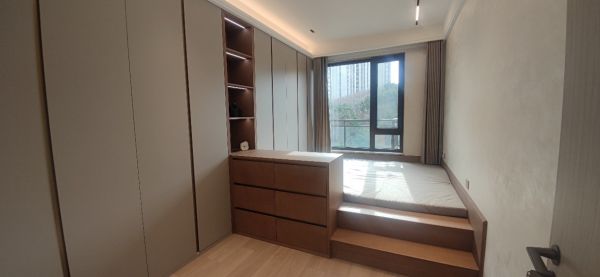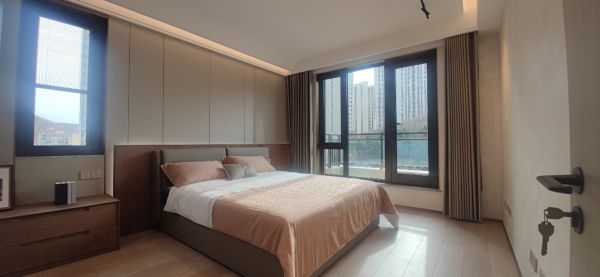 次卧设计通过几何线条的介入将空间体量简化,剔除琐碎,在基本元素的抽象演绎下,延续红调的点缀作用。丰沛的自然光线,细腻亲肤的床品,营造出温馨舒适的休憩空间,让人卸下疲惫,尘嚣烦扰俱消。