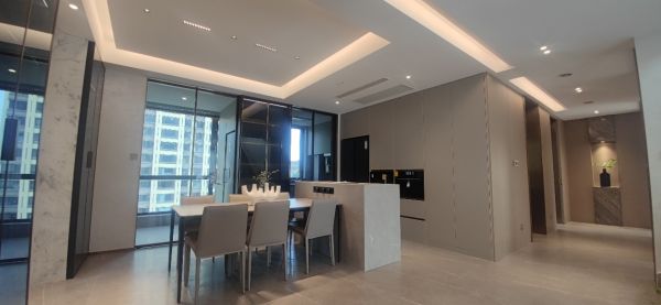 在空间整体的灯光设计上,摒弃纷繁富丽的无主灯,抛却外化的藻饰,将留白的艺术投注其中,灯带光影丰富了空间层次,呈现朗阔旷达的中空格局。