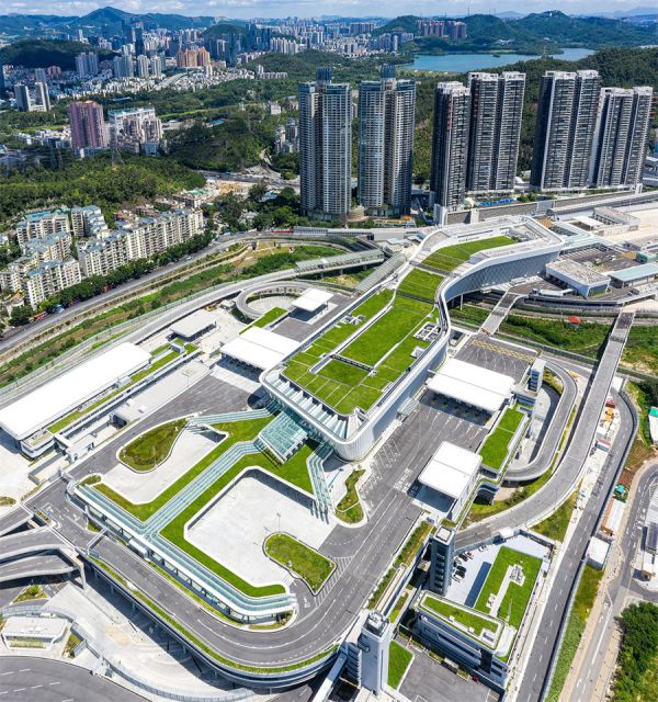 香港首个“人车直达”的陆路口岸,采取多层式及流线型设计以减少用地和对周遭乡郊环境的影响,公共空间大大促进粤港澳大湾区的整体交通联系。建筑外围设有自遮阳装置,降低室内温度;屋顶太阳能板每年可产生再生能源;自然通风的公共区域配合可检测污染程度的排风及新风系统,可减少不必要的电力开支;配合使用LED照明、高能效比空调、日光传感器和低遮阳系数玻璃窗,使建筑节省约10%的能源;整体能耗减少24.5%。项目在香港绿建环评 (BEAM Plus) 中被评为金级。