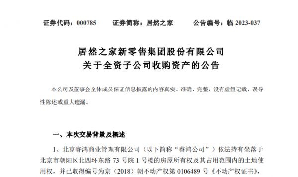 5月29日,居然之家(000785.SZ)公告称,居然之家旗下全资子公司北京居然之家拟以19.63亿元收购北京市朝阳区远洋未来广场主体物业、产权车位、人防工程及相关附属设施。远洋未来广场总建筑面积8.17万平方米,收购总价为19.63亿元,其中现金支付10亿元,承接债务9.63亿元。