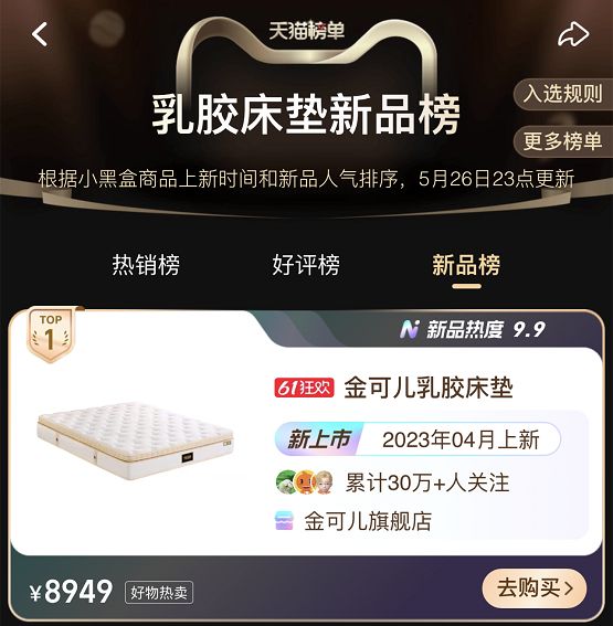 2023年5月,国际知名床具品牌KINGKOIL金可儿特别举办了2023线上款新品发布会,正式在天猫、京东、抖音等各大电商平台同步发布了“1898典藏系列”新品床垫及床架产品,以此庆祝品牌成立125周年。自发布以来,金可儿“1898典藏系列”收获了众多消费者的好评,品牌影响力持续扩大。就在刚刚开启的618活动期间,“1898典藏系列”床垫以9.9分的新品热度,强势登顶天猫【乳胶床垫新品榜】榜单TOP1。