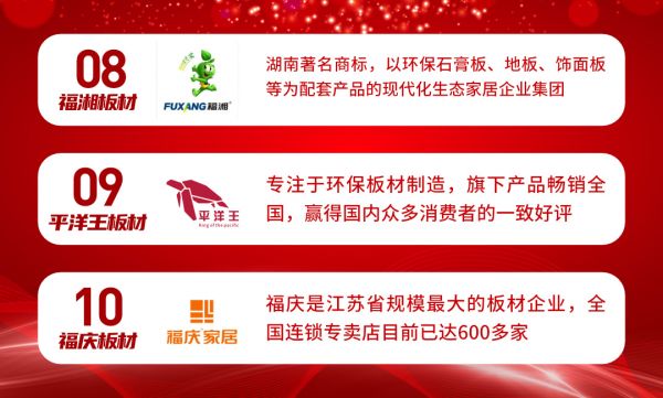 10、福庆板材:福庆是江苏省规模最大的板材企业,全国连锁专卖店目前已达600多家