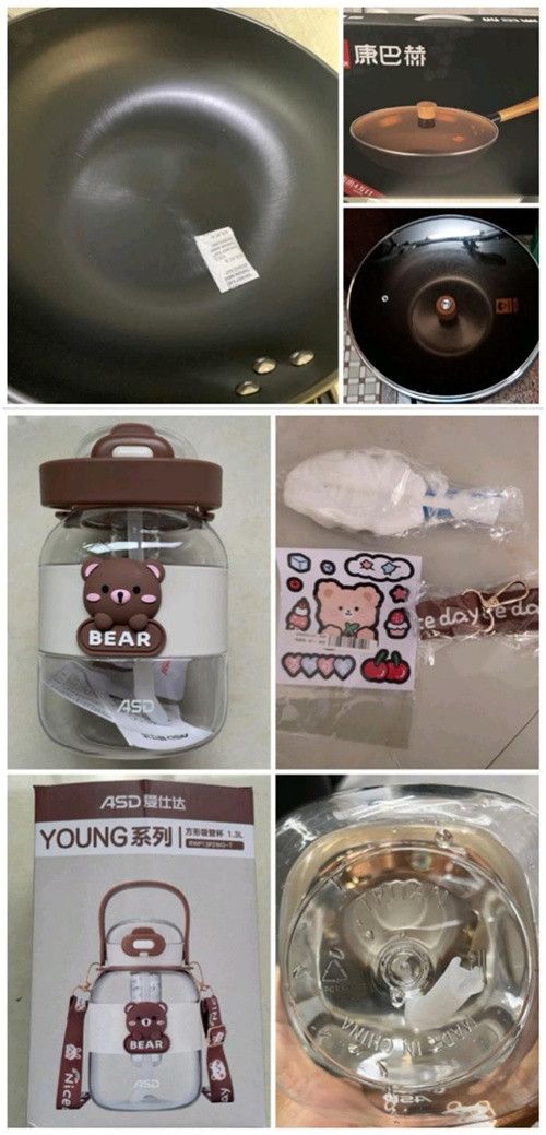 虽然平时不太做饭,但一口趁手的锅还是必备的。99元的康巴赫炒锅,按照说明书开锅后使用真的不粘锅,煎蛋、炒菜非常丝滑。还有肚大能装的爱仕达吨吨杯,瓶身上有非常可爱的立体小熊,还赠送背带,出去逛街、玩耍太方便了。