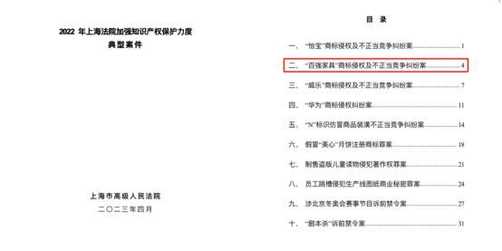 “百强家具”商标侵权及不正当竞争纠纷案中百强家具获赔1196万元创行业新高,同时该案件入选为上海法院十大加强知识产权保护的典型案例。