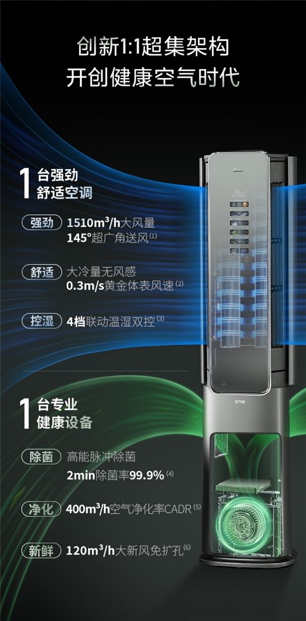 人的一天时间中有三分之二在室内度过,在炎热的夏日,人们对空调的依赖度比任何电器都高,美的鲜净感空气机突破模块化集成,革新底层架构,空调模块与健康空气模块1:1专业集成,实现了多种核心功能集成,使其不仅是一台性能强劲的空调,也是一台专业的健康空气设备。既能在夏日带来凉爽舒畅的体感,也能保证室内空气健康洁净。